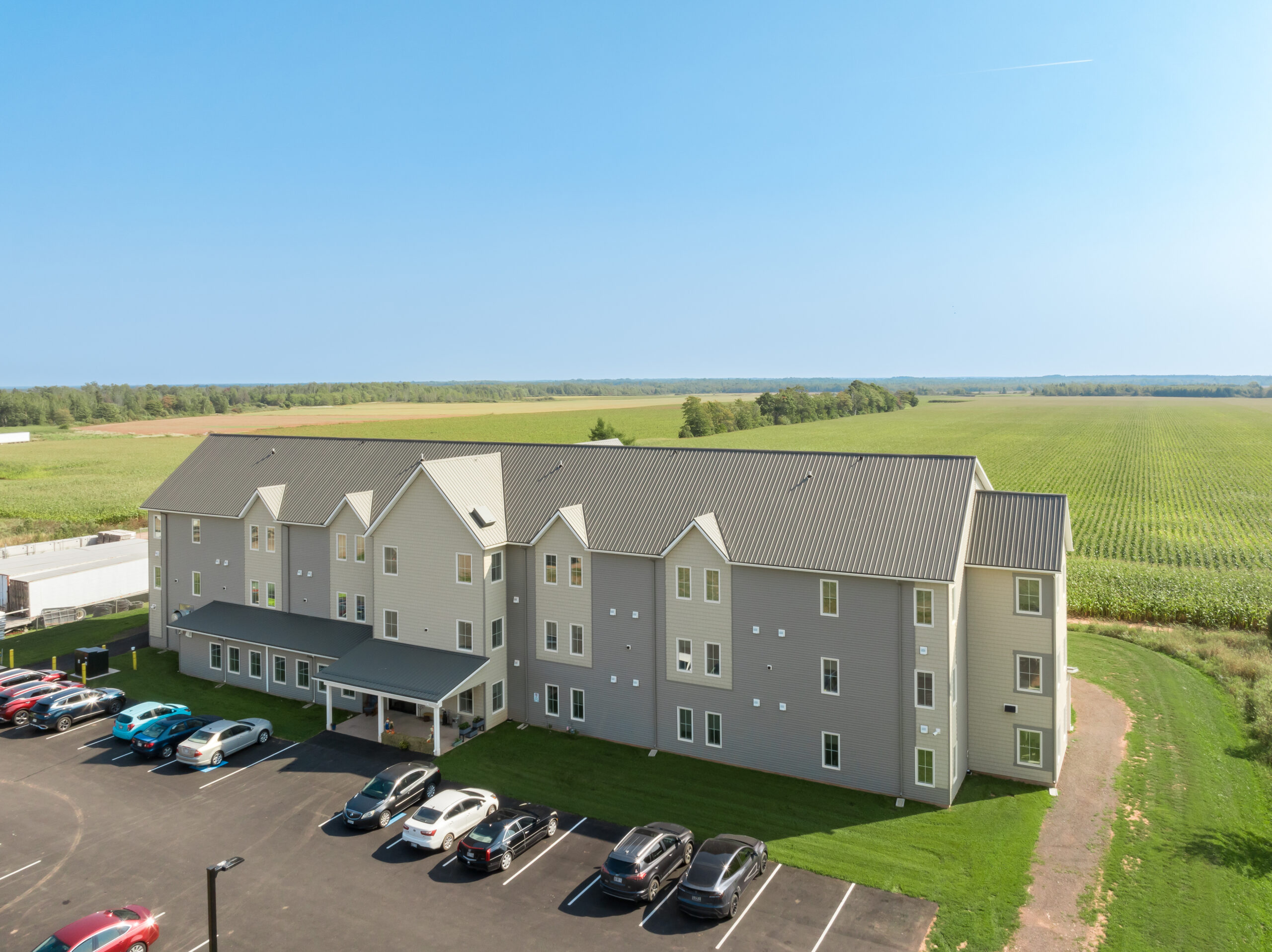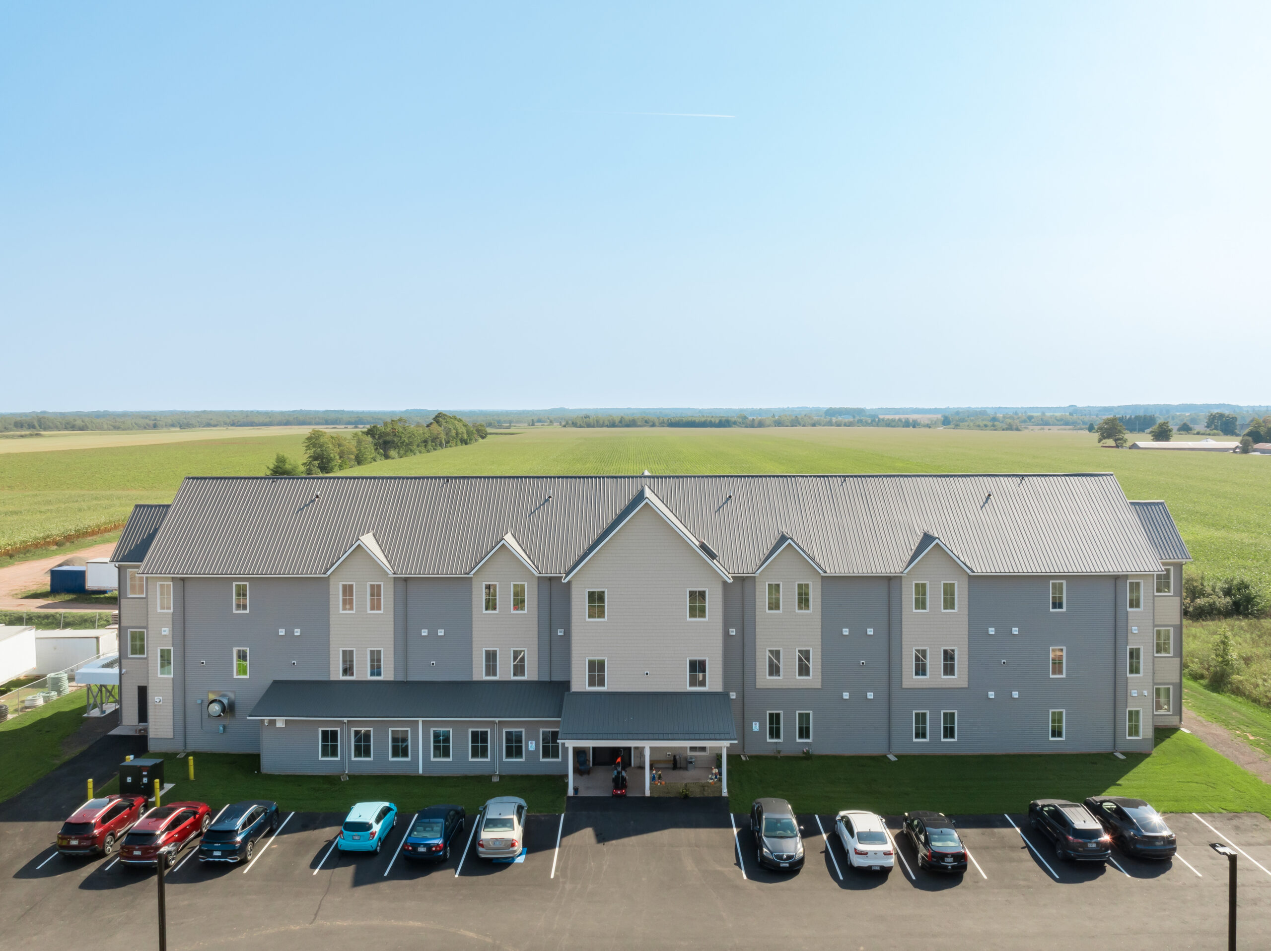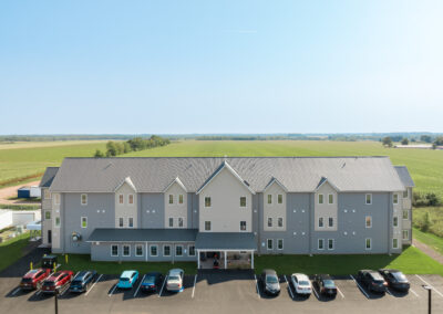 The Willows Community Care Residence in O’Leary, PE has 50 affordable, fully accessible private rooms for seniors, each with its own half bathroom. Boasting triple glazed windows, R40 wall insulation, geothermal heating/cooling, and an initial 100kW photovoltaic array installation, the Willows is designed to be Net Zero ready. The large community room on the main floor hosts activities and musical events for residents, their families, and for the local community.